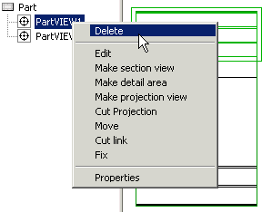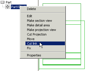 - In order to be able to edit the lines in the drawing, cut the connection between the projection and the model: move the cursor over the projection label in the projection tree and select the context-sensitive function Cut link.