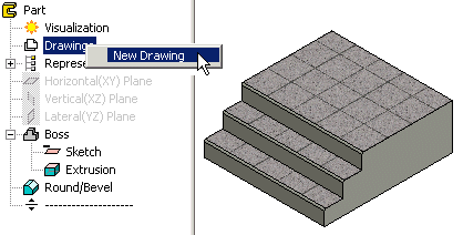 - In the part model's feature tree, right-click Drawings, and select New Drawing.