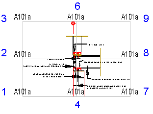 When you add a detail as a drawing, the detail label is also added to the floor plan if the keyword detail_label_lorg in the BDSXX keyword group has a value from 1 to 9. The value determines the location of the label relative to the drawing, according to the diagram below. If detail_label_lorg = 0 (default value), the label is not added.