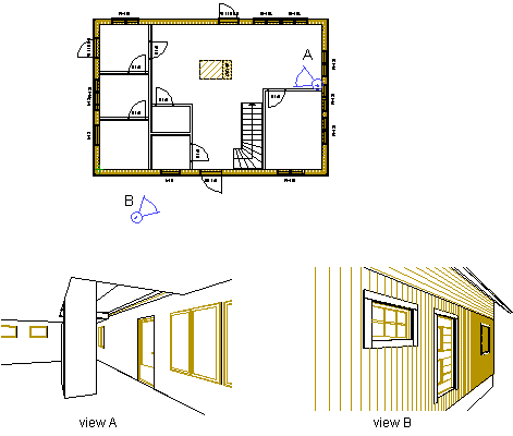 In the example below, two perspective views have been defined in the 2D drawing of a building with labels A and B. In both perspective views the elevation position of the view point is 1500 mm, slanting angle is 0 and the width of the viewing angle 75 degrees. The perspective views have been given the names view A and view B.