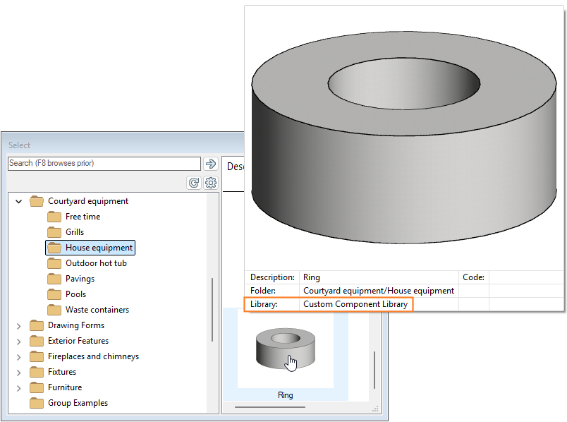 Add a building component saved in the component library, for example a piece of furniture, as follows: