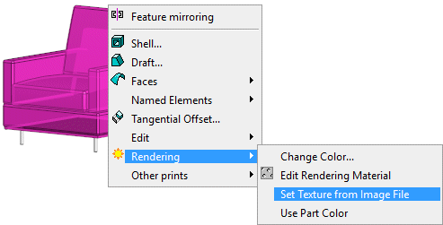 Rendering > Set Texture From Image File from the context-sensitive menu. - You can add a texture to all surfaces of the part model also by importing the image file to the model window by using the drag and drop method.