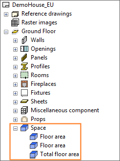 Based on the calculated areas, the program automatically creates its own space objects for the floor area and the total floor area.