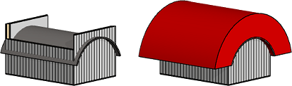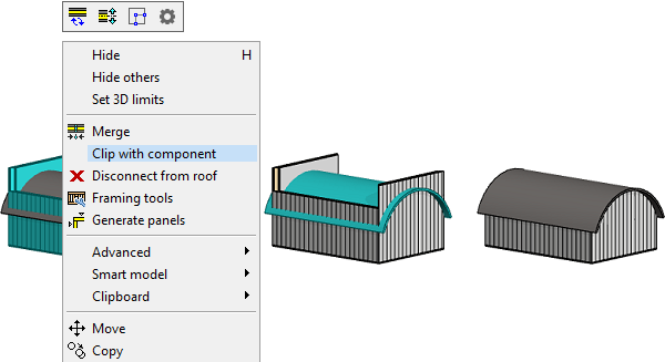 The top edge of an architectural wall can be cut with an arc-shaped component. A roof object cannot be curved in Vertex BD, but you can model a component that represents a curved roof with the 3D modeler. The feature is intended for straight walls in the architectural model (the wall must be vertical and non-curved). The clipping feature is available when the user/setup file contains the keyword: