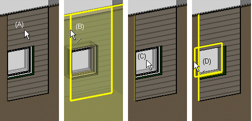 Coindidence. - Select the wall volume (A) and the edge line (B). Then, select the window (C) and the