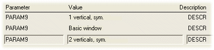 - Click the Select button. The Available parameters database view opens. The view presents the available parameters for components of the selected object type. All values used in the building model are displayed for each parameter, which means that the same parameter may appear on several rows. For example, a window description text PARAM9: