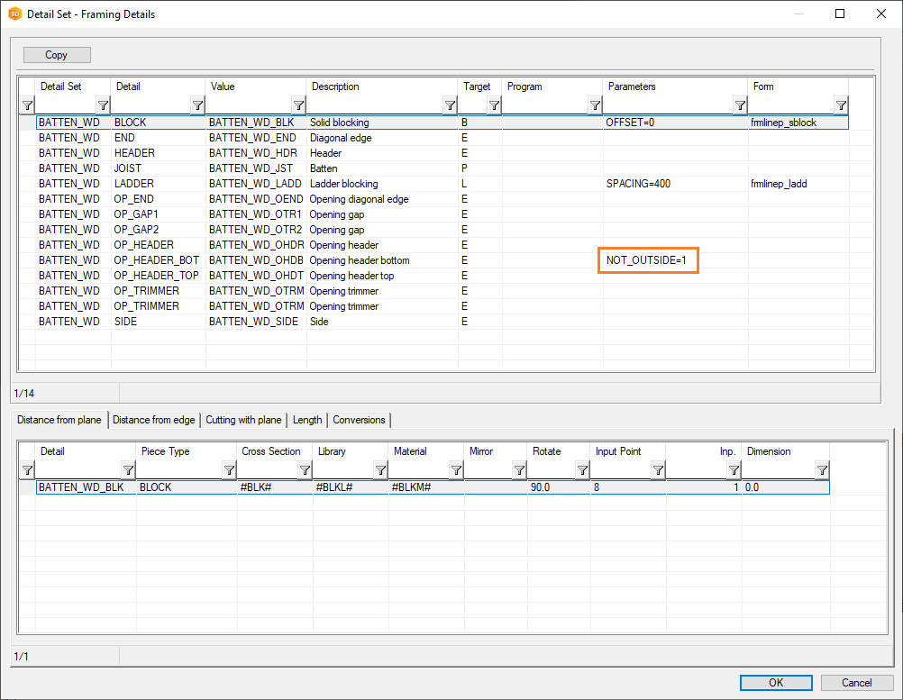 In a certain situation, a part of a wall panel’s sub frame can be located outside the structure layer when parts are added to the structure. To prevent this, you can set the parameter NOT_OUTSIDE=1 for the framing tool detail in the framing area assembly library.