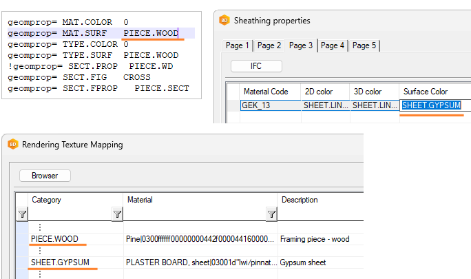 - The category of the default rendering material of profiles is defined in the PROFPROP file of the profile library. The category of the default rendering material of sheets is defined in the sheet library. A default rendering material is set for these categories in the material link database. For more information, see Default Rendering Materials.
