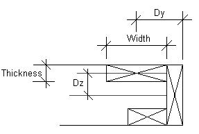 Dz indicates the distance of the center line of the piece from that of the framing. The positive direction is from the center line of the framing towards the outer surface of the panel. Dy indicates the distance of the nominal line of the piece from the center of the piece. Dy is half of the cross section width for side studs and 0 for other studs. For jamb studs, Dy can be in accordance with the figure below, for example. Thickness is the cross section dimension in the direction of the depth of the framing, and Width the cross section dimension in the direction of the length of the panel.