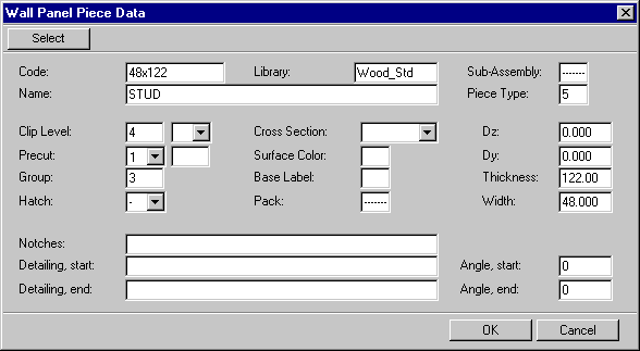 Clip level indicates the clip level of the piece. Precut determines whether the piece's material is linear meter timber (0) or precut timber (1). Group indicates the priority of the piece when pieces in the panel cross each other. The piece with the lower priority (higher number) will be removed. When you select X from the Hatch list, the piece will be rastered in the panel drawing.