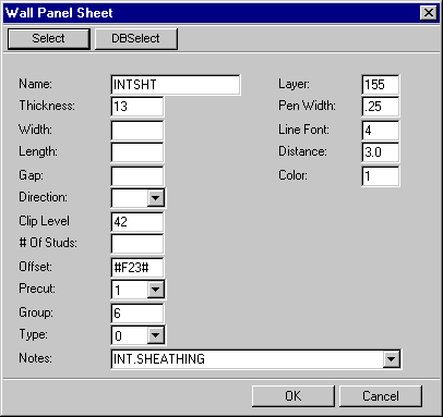 The fields will be automatically filled in when you select the sheet using the Select or DBSelect button. The Select button displays a drawing window in which you can select the sheet by clicking the hot spot. The DBSelect button displays a list from which you can select the sheet. The value in the Offset field determines the location of the center line of the sheet in relation to the center line of the panel. The program will automatically calculate the field value based on the framing thickness, sheet thickness and the side of the sheathing (internal or external sheathing).