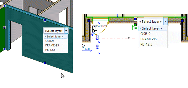 - Select the layer from a list in the floor plan drawing or in the model. The list is