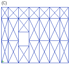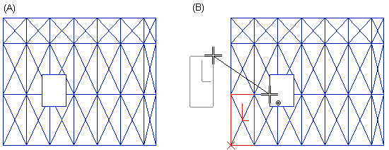 In figure (A) below, sheathing has been created for a horizontal structure with an opening. The default origin point is in the lower left corner of the horizontal structure. Add a new origin point to the sheathing. Select the upper right corner of the sheet as the reference point of the origin sheet. In figure (B), the reference point is set to the intersection of the edge line of the opening and the top edge of an existing sheet. Figure (C) shows the refreshed sheathing.