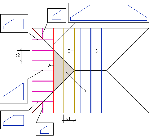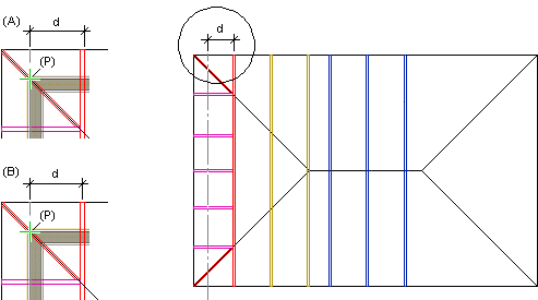 - The parameter determines the location of the first hip truss. Type the distance (d) between the truss and the bearing line defined by the selected corner points in the text field. By default, the distance is measured to the edge of the truss (A). If you want to measure the dimension to the center of the truss, select the checkbox Centerline dimensioning (B).