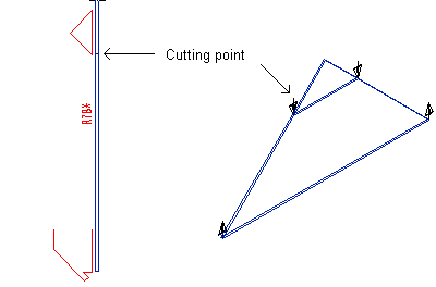 You can use this function to merge trusses cut in the vertical direction. When you select the function, the program marks the cut trusses and the cutting points in the layout drawing and model in the following way:
