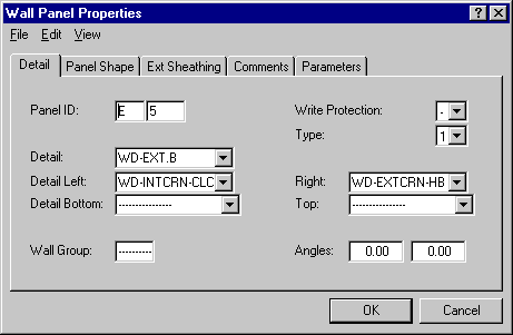 On the first tab, Detail, you can select the wall ID and the framing details in customer-specific lists. Later, when generating, editing and saving panel drawings, you can write-protect the panel drawing, so that it cannot be deleted or regenerated from the floor plan drawing. You can deselect write protection by opening the panel attributes for editing and setting the Write Protection field value as "-".