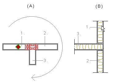 Select the detail in the drawing window by clicking its hot spot. In the detail, the walls connecting in the corner have been numbered so that the wall with the hot spot is wall number 1, a so called reference wall. You will click a wall corresponding the reference wall in the floor plan, when you select the corner to which the detail will be applied. The numbers of the other walls are determined by going around the corner in clock-wise direction. Each wall has its own detail defining the way the wall is connected to the corner. The example figure A below displays the selected corner detail. Figure B displays the order in which the wall details are applied when the wall marked with an arrow is selected as the reference wall.