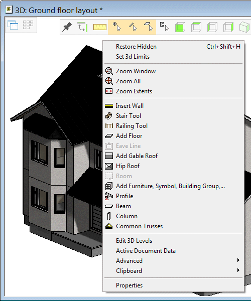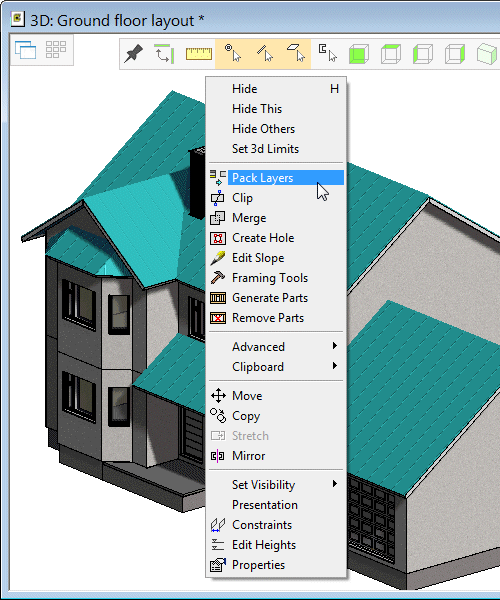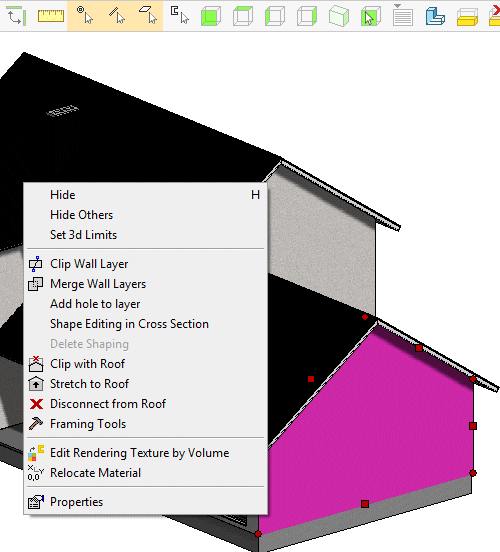 When shaping a layered structure (wall, floor, ceiling or roof), first select the structure and then the layer. Note that the selected objects are marked in different colors. Right-click to open the context-sensitive menu and select the desired function.