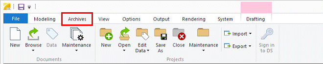 Functions related to buildings are on the Archives tab. Opening, closing and saving a building can also be selected from the File menu.