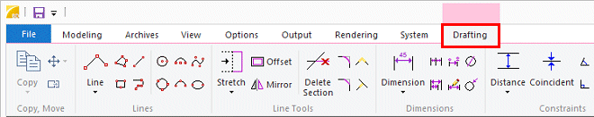 Lines, dimensions, texts and hatches can be found on the Drafting tab.
