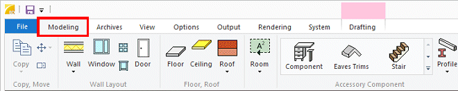 Most of the functions are located on the ribbon bar. The ribbon has been divided to tabs, and on each tab functions related to each other are grouped together. The basic tabs are always visible. The home tab is Modeling, which contains mostly functions for adding objects.