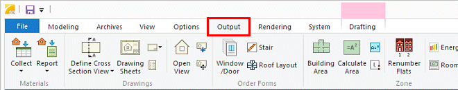 Functions related to material reports, drawings and other documents generated from the model can be found on the Output tab.