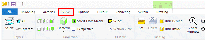 The View tab contains functions for viewing a drawing or a model as well as controlling the windows. Some of the functions are also available on the tool strip at the top of the working window.