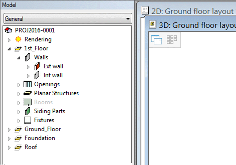 The object tree presents all building objects categorized in a hierarchical order. When you open a building, the object tree is opened with the document browser on the left side of the workspace. Set the object tree visible by selecting the browser tab Model.