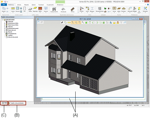 The workspace is a window in which the working windows (A), document browser (B) and object tree (C) of the building will be opened when you open an existing building or create a new one. The size of the working windows is determined by that of the workspace. You can change the size of the workspace by dragging the frame or a corner of the software's main window.
