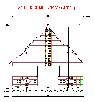 Open a log work drawing of a wall for viewing and printing in a separate drawing window. In addition to a parallel projection of the wall, a log work drawing includes, for example, the label text, log labels, wall dimensions and machinings. You can open several log work drawings in the same drawing window. The function is available in the floor plan.