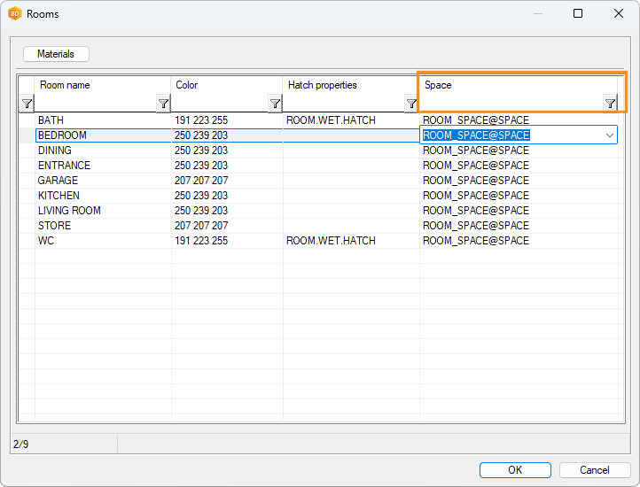 The update function adds the SPACE field to the ROOMS database of the customer-specific room library. It is possible to define a default space for a room in the field. The space is selected from the space library.