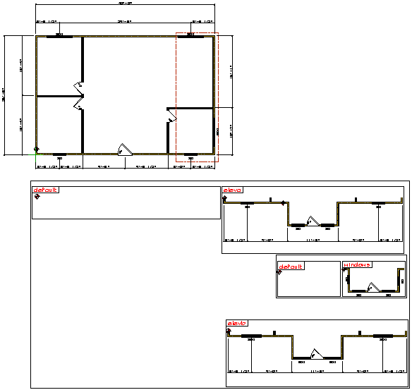 The program copies the objects you selected to an option box with the option id Default. It also adds another option box with the option id you selected to the drawing. This box is empty, as the objects of the option are to be modified on the actual building. You can now modify the objects to design the option. You can add, delete or trim walls, for example. One of the major features of options is to create optional elevation conditions that you can use to create a number of different styles.