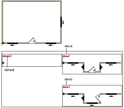 In the figure below, the default option is currently activated. The eleva option has been added using the Create a New Option function and then modified by adding walls and openings. The elevb option has been created by copying and modifying the eleva option.