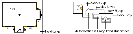 First add an alignment point to the floor plan drawing, for example 1st Floor Walls drawing. Type a code for the alignment point, for example 1W (for 1walls). The program will automatically generate alignment points with the same code 1W to the elevation view drawings (elev-B.vxp, elev-F.vxp, elev-L.vxp and elev-R.vxp).