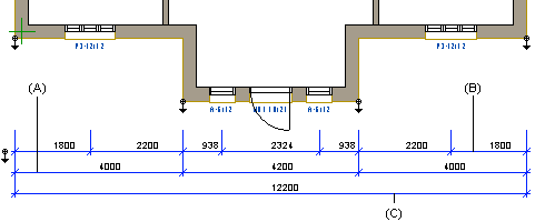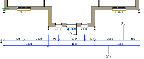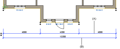 - When this checkbox is ticked, the program will add a queue dimension dimensioning the distances between the group's dimension point macros and the center points of the openings nearest to the dimension point macros. The end points of the dimension line are the dimension point macros closest to the outermost openings. The opening dimension is always the top dimension line in the group.
