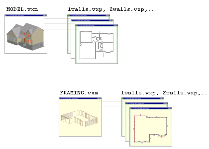 A building can be divided into parts, for example by floors. Each part is designed in its own drawing-model pair. A drawing-model pair contains one drawing file (*.vxp) and one model file (*.vxm). A model file can form a pair with several different drawing files, and vice versa. The model file may be either of the following: