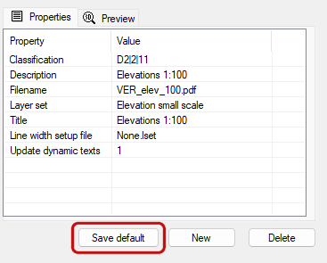 - To save a property set as the default, click Save default under the property list. The next time you add a new document and select the same publishing file type, the document will have default properties for which you can select values.