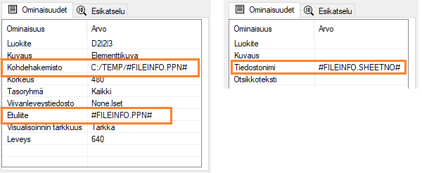 Enter the FILEINFO data in the format #FILEINFO.FIELD_NAME#. For example, the sheet number: #FILEINFO.SHEETNO#. You can also use the data as part of the string: ABC_#FILEINFO.SHEETNO#.