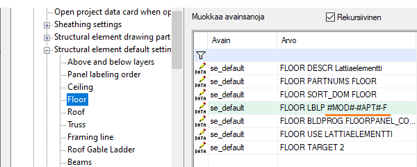 For floor and roof panels, the additional attribute of the label is set in the system settings, in the bdsxx / Structural element default settings keyword group. For example, for floor panels: