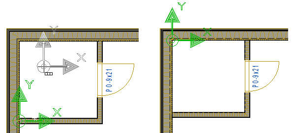 The origin point of the smart model is represented by an arrow symbol in both the floor plan and the model.