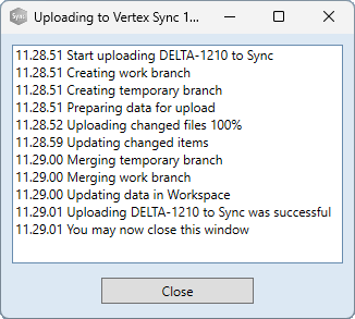 When the program starts the upload to Vertex Sync, a window will open in the lower right corner of the screen showing the progress of the upload. A new window opens for each upload process. You can continue to work while the upload is in progress.