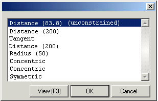 The geometric constraints added to the drawing are displayed as a list. Unsolved constraints highlighted on the list.