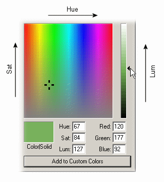 You can freely select any RGB color by clicking on the color gradient in the dialog box. The selected color has a certain hue and saturation. You can adjust the color's luminosity with a slider.