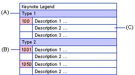 - Keynote type (A). If a description text has been defined for the type in the KEYNOTE_TYPES database, the description text can also be displayed on the row.