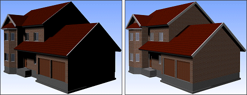 In the example figure on the left, a distant light with an incoming direction from the front of the building and intensity of 0.8 is on in the model. On the right, a distant light fixed in the viewing direction with an intensity of 0.4 is also on.