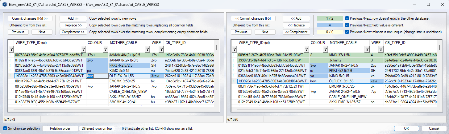 - When you select a row, the corresponding row is also selected in the other database if Synchronize selection is enabled.