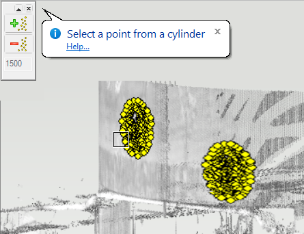 Add cylinder. - Move the cursor near a point whose nearby points form a cylinder. The cursor will search around the point for a set of points, which will help you to see which points will be used to create the cylinder later on. If you notice that the set of points includes scattered points that do not belong to the cylinder, move the cursor a little to achieve a better set of points.Note: You can select more than one set of points. Finish selecting set of points by selecting Confirm.