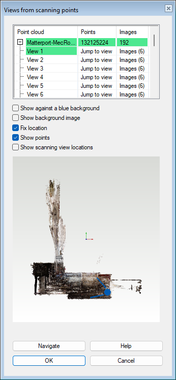 At the top of the dialog box, the point clouds in the active model are displayed, from which you can select the cloud to be viewed. The list box displays the scanning point views for the point cloud. You can activate a view in the list or click the location symbol for the view. If a point cloud consists of only one scan, only one viewpoint is available.