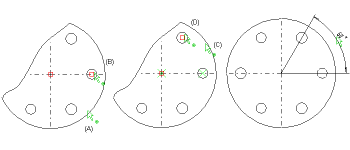 Kulman mitoittamiseksi määritetään yhdensuuntaisprojektiosta kulman aloitusviiva suuntapisteillä (A) ja (B), jotka ovat ympyröiden keskipisteitä. Kulman lopetusviiva määritetään vastaavalla tavalla pisteillä (C) ja (D), jonka jälkeen osoitetaan mittaluvun paikka.