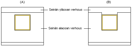 Alla olevassa kuvassa (A) toiminto ei ole ollut valittuna käyttöön ikkunaa lisättäessä. Kuvassa (B) toimintoa on käytetty, ja ikkunan yläpuolella oleva materiaali on korvattu seinän yläosan verhouksella.
